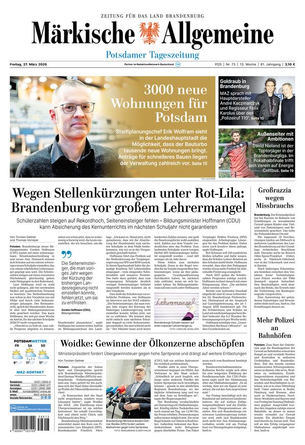 Die Märkische Allgemeine ist die Tageszeitung für Potsdam und Umgebung. Das ePaper der MAZ bietet aktuelle News aus den Bereichen Politik, Wirtschaft, Kultur und Sport. Weiterlesen...